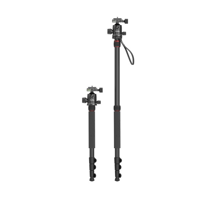 El trípode de aluminio SmallRig CT-10 para cámaras 3935 está diseñado principalmente para la grabación de vídeo, filmación, retransmisiones en directo, etc. Cuenta con un tornillo de 1/4"-20 en la parte superior para fijar accesorios y, para una mayor compatibilidad, está equipado con un tornillo de rosca hueca de 1/4"-20 × 3/8''-16. Este producto compacto, que se puede extender hasta 180 cm y plegar hasta 43 cm, pesa solo 1530 g y es ideal para la fotografía en exteriores. La rótula metálica giratoria de 360° tiene una bola de Φ36 mm, es resistente y estable; las robustas patas de aleación de aluminio soportan hasta 15 kg y el soporte cuenta con tres orificios con rosca de 1/4"-20 para fijar el equipo según sea necesario. El trípode se puede convertir fácilmente en un monopié y se suministra con tres niveles de burbuja que satisfacen diversos requisitos de calibración. El paquete también incluye un soporte para smartphone para retransmisiones en directo y la grabación de vídeos cortos.