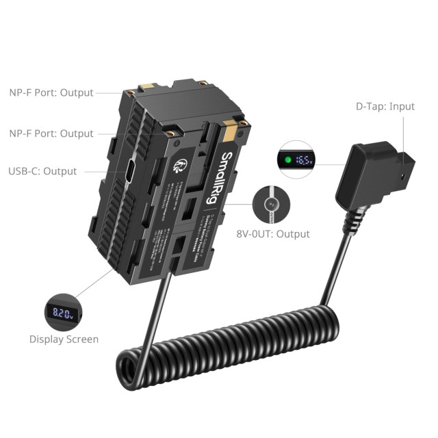 El cable de alimentación SmallRig D-Tap para la batería simulada NP-F 4884 de doble cara es un cable de alimentación multifuncional para batería simulada con una entrada D-Tap y cuatro salidas: dos salidas NP-F, una salida de corriente continua y una salida USB-C, lo que permite cargar cuatro dispositivos simultáneamente. Las salidas NP-F alimentan monitores y transmisores de vídeo, la salida de CC alimenta cámaras a través de baterías ficticias y la salida USB-C alimenta dispositivos como motores de enfoque motorizado y teléfonos móviles.