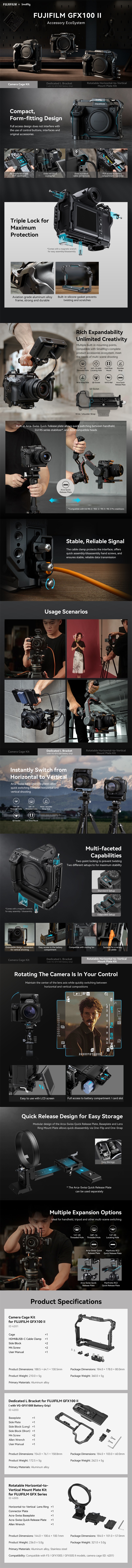 El soporte en L específico de SmallRig para la FUJIFILM GFX100 II con empuñadura de batería VG-GFX100ll 4203 facilita el cambio rápido entre la orientación horizontal y vertical. Fija la cámara mediante un tornillo de 1/4"-20 en la parte inferior y un adaptador de bloqueo lateral en el lado izquierdo, y se suministra con dos adaptadores de bloqueo lateral (configuración estándar / configuración ampliada). En el modo de disparo vertical, la placa lateral no se deforma, por lo que es más estable. Su placa base y la placa lateral están equipadas con almohadillas de silicona que protegen la cámara FUJIFILM GFX100 II de arañazos. Ambas permiten un acceso abierto a los puertos, funciones o botones de la cámara, como la tapa de la batería, la pantalla abatible, los cables, el ventilador de refrigeración FAN-001, etc. En particular, la placa lateral se puede extender 18 mm para permitir el paso de los cables al fotografiar en vertical. Hay varios puntos de fijación disponibles, como un orificio roscado de 1/4"-20, un orificio roscado de 3/8"-16, un soporte QD, una zapata fría y un orificio para correa de hombro/mano, que admiten la correa de hombro 4118, el micrófono 3468 y el trípode 3989 / 4307. Además, se incluye un destornillador magnético de ranura para facilitar el montaje de los accesorios.