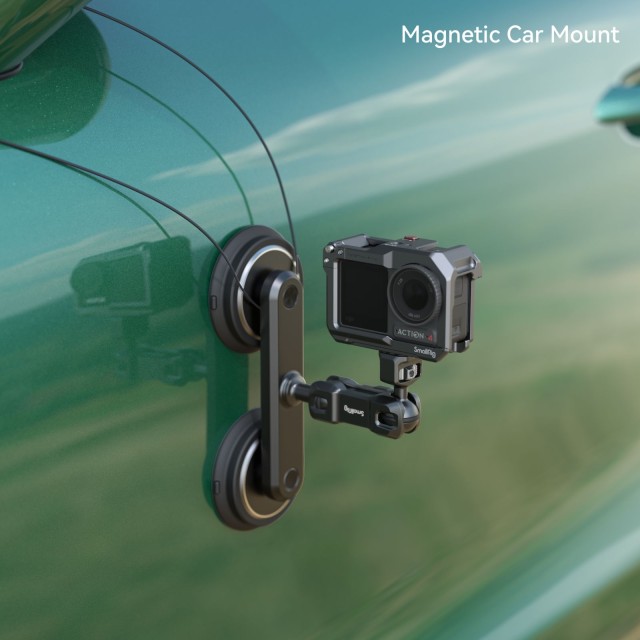 El kit de soporte de montaje con ventosa magnética doble SmallRig para cámaras de acción 4467 está diseñado para grabar escenas en el coche con una cámara de acción. Se recomienda utilizarlo únicamente en superficies metálicas planas, como puertas de hierro, barandillas, utensilios de cocina, equipamiento deportivo, etc. Su diseño exclusivo de dos materiales combina imanes con una ventosa de vacío, lo que garantiza una grabación más segura, duradera y estable. Incluso en el improbable caso de que la ventosa de silicona se desprendiera debido a fuertes vibraciones, los imanes pueden atraer todo el soporte de montaje hacia la superficie metálica del vehículo (dentro de la capacidad de carga de 0,35 kg / 0,8 lb en una escena de grabación dinámica en carretera recta, donde la velocidad máxima no supere los 120 km/h o 74 mph), lo que evita eficazmente el riesgo de caída causado por el desprendimiento de la ventosa de silicona. El kit incluye una ventosa magnética para cada pata, un brazo magnético y un soporte para cámara de acción. El tornillo de 1/4"-20 en un extremo permite fijar una cámara de acción, un monitor, una luz LED de vídeo, un micrófono, etc., y las clavijas de goma integradas son compatibles con los modelos SmallRig 3084C, 3083C, 4088B, 4119B y otros accesorios con orificios de posicionamiento que evitan el desplazamiento.