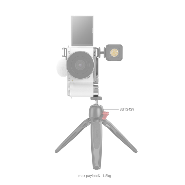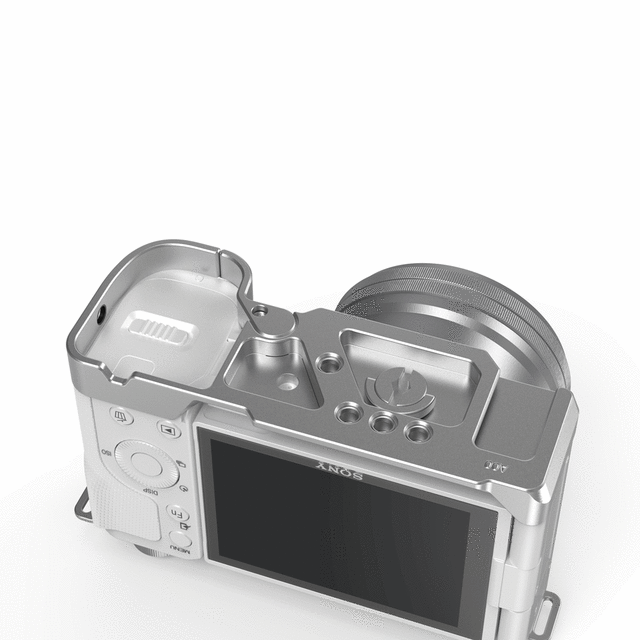 La empuñadura extensible SmallRig para Sony ZV-E10 (plateada) 3524 está diseñada para mejorar la experiencia de sujeción y proporcionar puntos de fijación para accesorios. La placa base se fija a la cámara mediante un tornillo de 1/4''-20 con anilla D sin necesidad de herramientas. La parte inferior cuenta con una placa de fijación rápida Arca integrada, que permite un montaje rápido en un trípode. La parte inferior cuenta con varios orificios con rosca de 1/4''-20, compatibles con las placas de fijación rápida DJI RS 2 y RSC 2 (superior). El lado derecho cuenta con una rosca de 1/4" -20 para montar un trípode para tomas verticales, y sigue permitiendo el acceso a la pantalla abatible y a los puertos de cable. Cuenta con una zapata fría en la parte inferior que permite montar un micrófono o una luz; la distancia entre la placa Arca y la zapata fría ha sido probada exhaustivamente, por lo que puedes montar un trípode Arca y un GoWireless al mismo tiempo. La tapa de la batería cuenta con una palanca para abrirla y cerrarla y un diseño giratorio para mayor resistencia y estabilidad, lo que garantiza una mejor experiencia de sujeción sin afectar al cambio de batería ni al estado general del dispositivo.