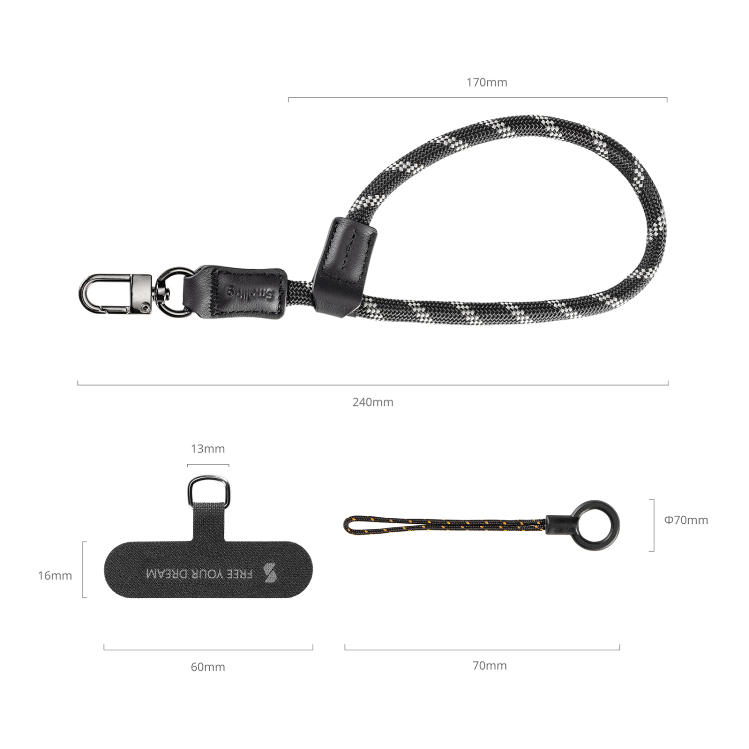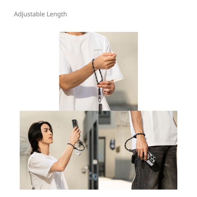 La correa de muñeca para teléfono SmallRig FilMov —una combinación de funcionalidad, estilo y respeto por el medio ambiente— tiene una longitud ajustable y un robusto gancho metálico para colgar el teléfono o accesorios como AirPods, llaves y llaveros. Su instalación sin herramientas ofrece una comodidad sin esfuerzo en el uso diario.
