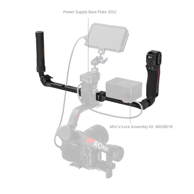 Las empuñaduras están equipadas con diversas opciones de fijación, incluyendo orificios roscados de 1/4"-20, orificios de posicionamiento de 3/8"-16, un soporte para zapata fría, rieles NATO, ranuras QD y orificios para correas. Esto permite acoplar placas de batería V-mount (ID 2988), que proporcionan alimentación de larga duración tanto al estabilizador como a la cámara. Las empuñaduras admiten el uso invertido y ofrecen un ajuste flexible del ángulo para grabar sin esfuerzo.