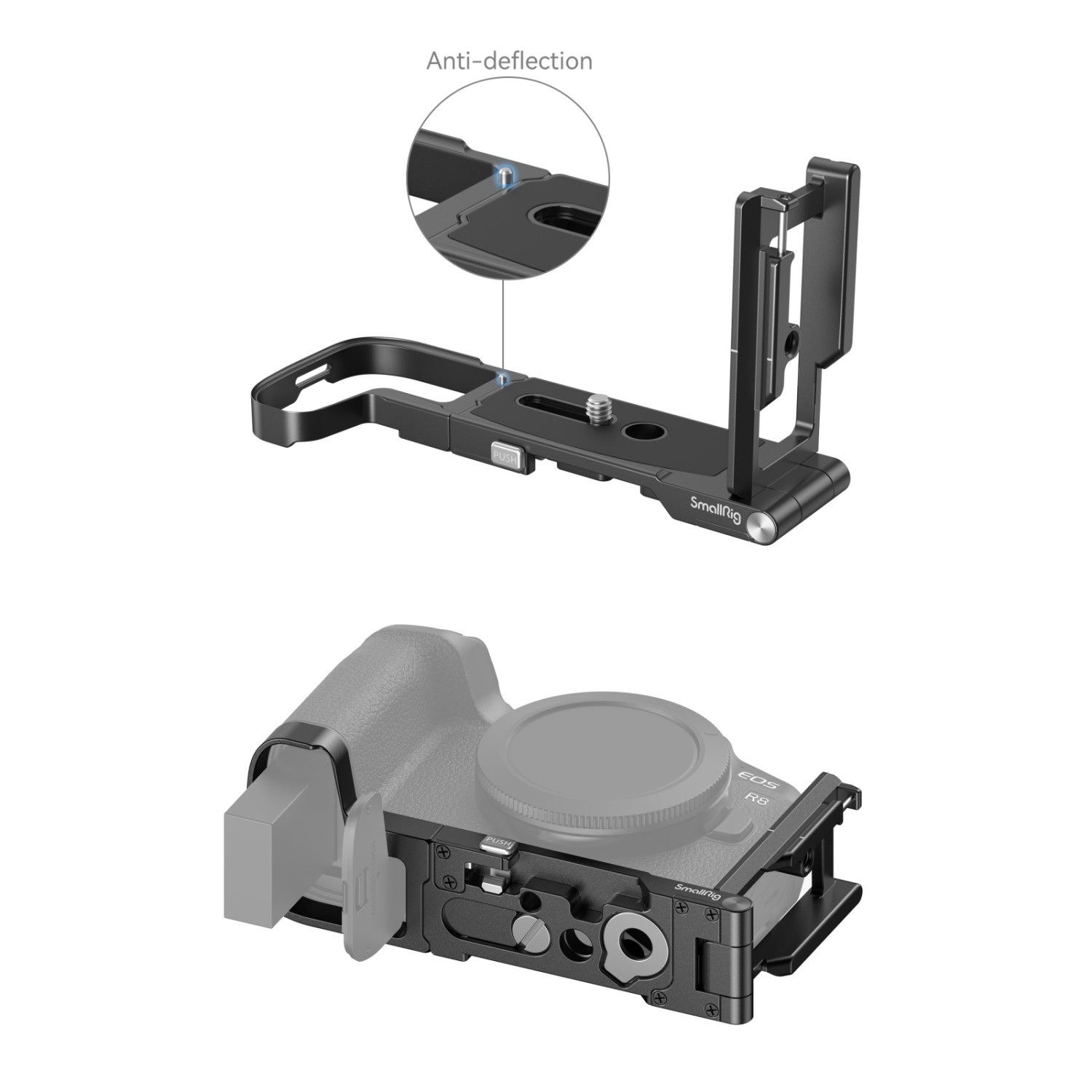 El soporte en L plegable SmallRig para Canon EOS R8 4211 facilita el cambio rápido entre la toma horizontal y vertical, al tiempo que mantiene el acceso a la pantalla LCD abatible. La placa lateral Arca-Swiss se pliega rápidamente hacia la parte inferior mediante un botón de plegado para la fotografía horizontal y se guarda como un único accesorio portátil. La placa base se puede extender hasta 20 mm durante la captura vertical para permitir el acceso a los cables.