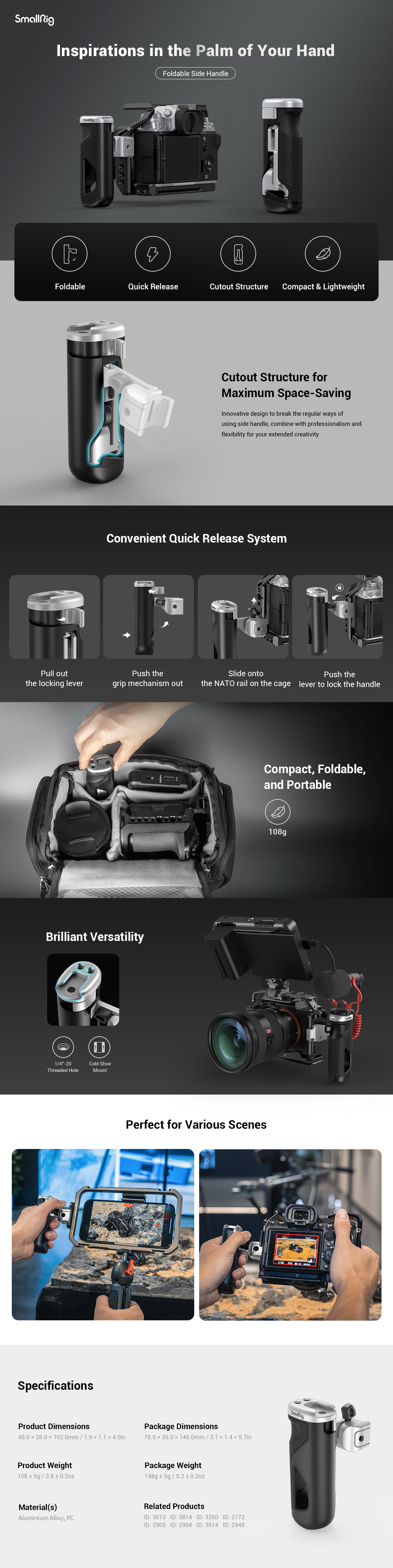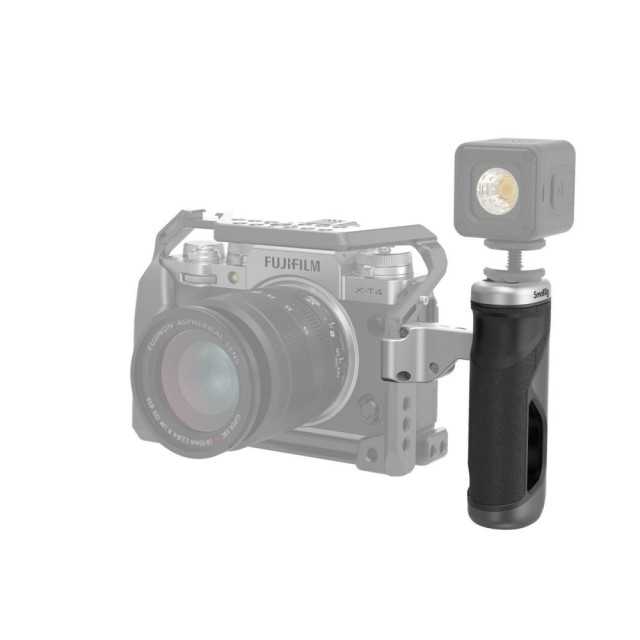 La empuñadura lateral plegable SmallRig 3922 está diseñada para ofrecer un agarre cómodo y un almacenamiento práctico. A diferencia de las tradicionales, esta empuñadura plegable y compacta se puede colocar en espacios reducidos o en un bolsillo. Su innovador diseño plegable y de fijación rápida permite un desmontaje y montaje sencillos, lo que facilita considerablemente el rodaje y el almacenamiento. El mango pesa aproximadamente 108 g y destaca por su ligereza, compacidad y portabilidad. Gracias a su cómodo sistema de bloqueo, es seguro y fiable. Está disponible tanto para zurdos como para diestros y cuenta con un soporte para pie frío y orificios roscados de 1/4"-20 en la parte superior para acoplar diversos accesorios.