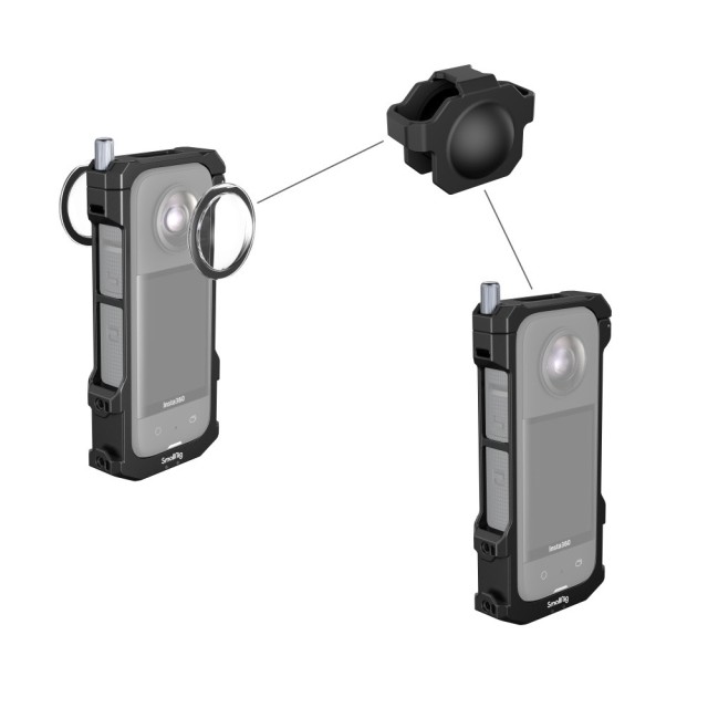 El marco SmallRig para Insta360 X3 4088B protege la cámara y facilita la grabación al ofrecer diversas opciones de fijación de accesorios. El marco, que se ajusta perfectamente a la forma de la cámara, está equipado con almohadillas de silicona que evitan los arañazos y, mediante un tornillo de mariposa, fija de forma segura la cámara, que se inserta en el marco desde su parte superior. A ambos lados hay dos soportes para accesorios, como micrófonos y luces. En ambos lados hay unas garras plegables incluidas para la instalación de palos selfies, bases, etc. Las garras plegables integradas en la parte inferior tienen un orificio roscado de 1/4"-20 para trípode. Además, el paquete incluye una tapa para el objetivo que evita que se raye.
