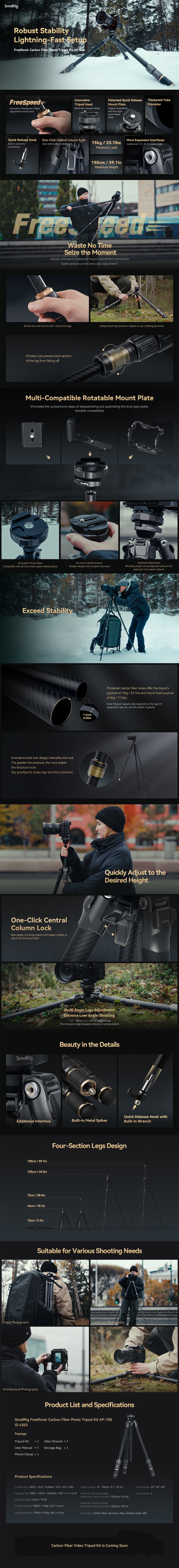 El kit de trípode fotográfico SmallRig FreeRover Carbon Fiber AP-100 4353 es un trípode compacto de fibra de carbono diseñado especialmente para fotógrafos que viajan. Las patas cuentan con el sistema de fijación rápida FreeSpeed-rotate, que permite un ajuste fácil y eficaz apretando un solo botón para bloquear las cuatro secciones. El uso de material de fibra de carbono de 1,2 mm de grosor para las patas y el poste central garantiza una estructura ligera sin reducir la estabilidad ni la capacidad de carga. El pilar central cuenta con una palanca de fijación rápida para ajustar rápidamente su altura. La parte inferior del pilar central está equipada con un gancho de fijación rápida con llave Allen, que permite acoplar y desacoplar cómodamente el equipo fotográfico. Además, el poste central cuenta con un poste corto desmontable que proporciona una altura mínima de 13 cm para fotografiar desde ángulos bajos. El trípode tiene una rótula invertida que, gracias a su diseño empotrado, permite un diseño más compacto y portátil cuando está plegado.