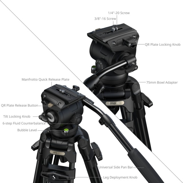 El trípode está equipado con un cabezal fluido con mecanismo de equilibrio de 6 grados y admite cargas de 0 kg a 6 kg (0–13,2 lb), mientras que el cabezal puede trabajar de forma segura con 10 kg (22 lb) y soportar una carga útil máxima de 15 kg (33,1 lb). Su altura de trabajo oscila entre 92,5 cm y 214 cm (36,4–84,3 pulgadas), lo que permite girar, inclinar y fotografiar desde las alturas con fluidez.