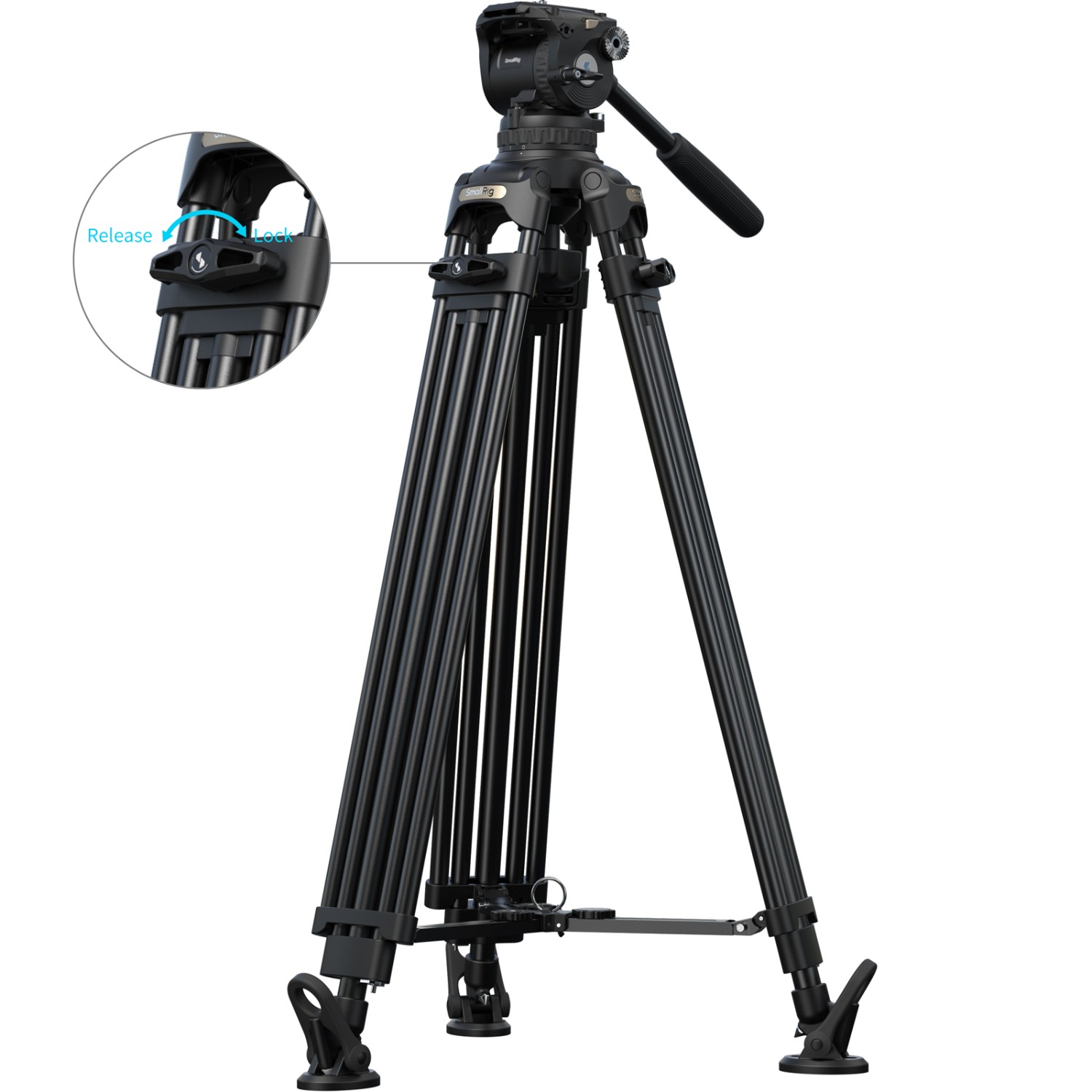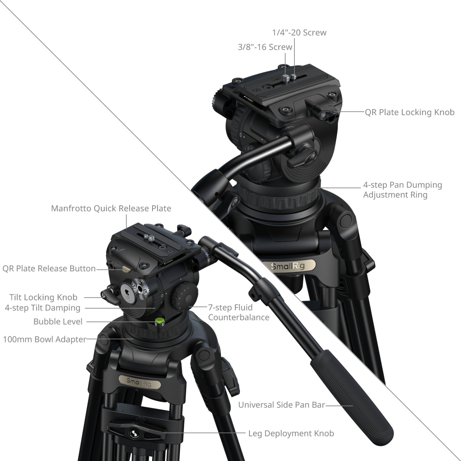 El trípode SmallRig FSD18 FreeSpeed Heavy-Duty, fabricado en aleación de aluminio 5577, está diseñado para cámaras y cineastas profesionales que buscan una estabilidad fiable y un movimiento fluido de la cámara bajo cargas pesadas. Sus patas de tres secciones de aleación de aluminio (Ø18 mm) con una configuración de segmentos 2-2-1 y una base de copa estándar de 100 mm garantizan una plataforma estable para un funcionamiento fluido del cabezal. El trípode está equipado con un botón giratorio para un ajuste rápido de la altura, lo que simplifica la configuración y el trabajo in situ.