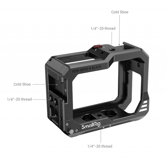 La jaula SmallRig 3084 está diseñada específicamente para los modelos GoPro Hero 12, 11, 10 y 9, y ofrece una protección resistente y una funcionalidad ampliada para tu cámara de acción. Esta carcasa cuenta con varios soportes Cold Shoe en la parte superior y lateral derecha para acoplar accesorios, como micrófonos y luces LED. También incluye un soporte plegable compatible con la placa base original de GoPro y un orificio roscado de 1/4"-20 para montarla en un trípode.