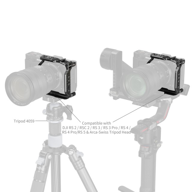La jaula media SmallRig para Nikon ZR 5905 está especialmente diseñada para mejorar la capacidad de ampliación de la cámara y simplificar el montaje del cardán. Cuenta con una estructura ligera de media carcasa que permite una instalación rápida y sencilla sin necesidad de desmontar la placa de liberación rápida del gimbal DJI RS, lo que ahorra un tiempo valioso durante los ajustes en el rodaje.