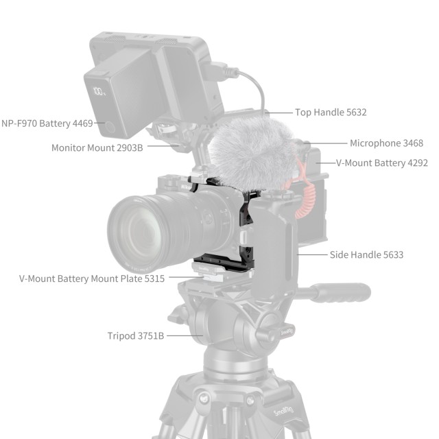 Para una máxima versatilidad, la jaula ofrece varias opciones de ampliación, incluyendo orificios roscados de 1/4"-20, orificios de posicionamiento de 1/4"-20 y orificios de posicionamiento ARRI de 3/8"-16, que permiten fijar accesorios como las asas superiores (ID 3765, 4927) y los brazos mágicos (ID 5308, 4900). La barra de fijación rápida HawkLock NATO integrada es compatible con empuñaduras superiores (ID 5632, 4483), empuñaduras laterales (ID 5633, 4485) y soportes para monitores (ID 4487). Además, el enchufe QD integrado admite correas de hombro QD (ID 4118B), mientras que los orificios especiales para correas admiten correas de muñeca (ID 3848) y correas de hombro (ID 4884, 5208).