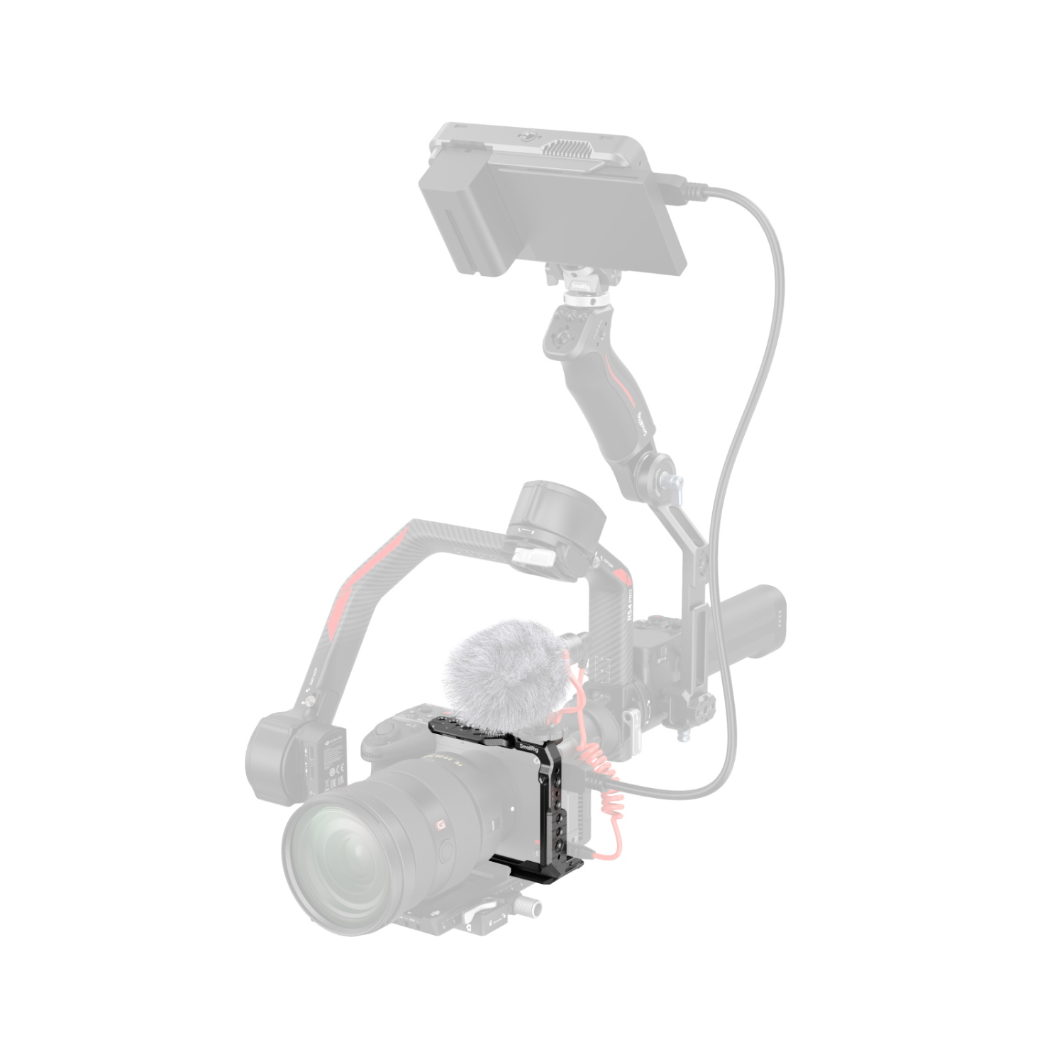 La placa superior extraíble está equipada con un riel NATO que admite la empuñadura superior Sony XLR o la empuñadura superior giratoria SmallRig (ID 4152) sin interferir con el EVF. Gracias a sus precisos recortes, esta jaula garantiza un acceso total al EVF abatible, a los botones y a los puertos de la cámara.