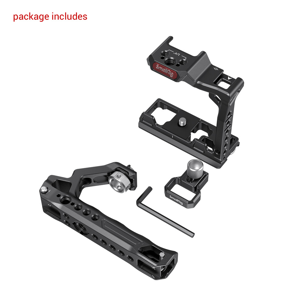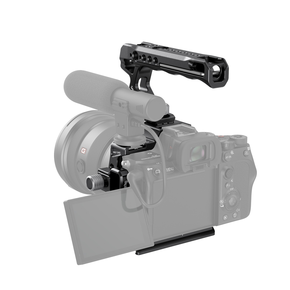 El kit SmallRig Half Cage para Sony Alpha 7S III 3237 incluye el SmallRig Half Cage 3193, una abrazadera para cable HDMI 3000 y una empuñadura superior orientable ARRI 2165. La empuñadura alivia la carga en la mano al grabar en ángulo bajo y está equipada con puntos de montaje para accesorios. La jaula y la empuñadura se suministran con varios orificios roscados de 1/4"-20 y orificios de fijación ARRI de 3/8"-16, disponibles para montar la empuñadura lateral SmallRig 2093 y el soporte para monitor 2903, y con soportes cold shoe para fijar micrófonos, luces LED y el soporte para monitor 2905.