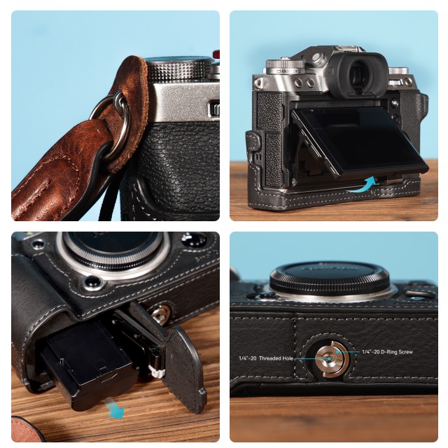 El kit de funda media y correa de muñeca SmallRig para la FUJIFILM X-T5 3927 está diseñado para proteger la cámara y mejorar la experiencia de sujeción. La clásica funda media, fabricada en piel de vacuno resistente y transpirable, se fija a la cámara mediante un tornillo de 1/4"-20 situado en la parte inferior. Permite un acceso total a la pantalla abatible, los botones, el compartimento de la batería, la ranura para tarjetas, etc. El marco integrado de aleación de aluminio de calidad aeronáutica no solo se adapta perfectamente a la cámara, sino que la protege de arañazos y golpes, mientras que la base de aleación de aluminio mejora el agarre. Además, la rosca inferior de 1/4"-20 permite fijar la funda directamente a un trípode. Y la correa de muñeca está fabricada en piel de vacuno y nailon para aumentar la comodidad y la fiabilidad. El botón de disparo independiente ayuda a mejorar el control táctil.