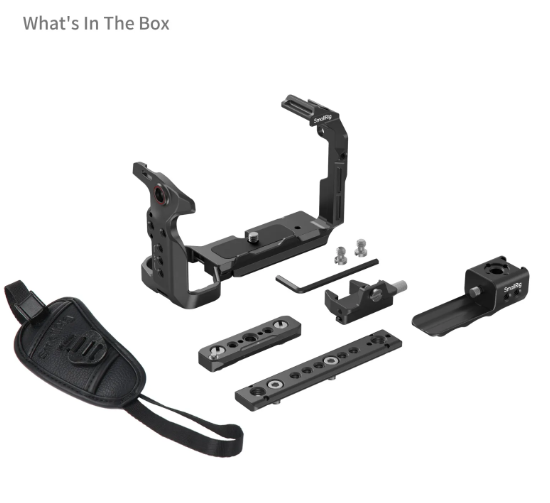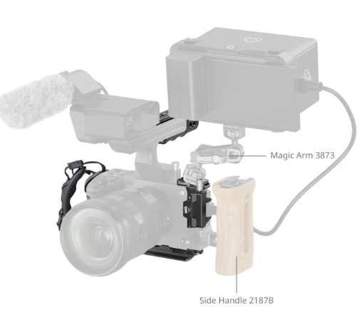 La estructura de la jaula también cuenta con un brazo articulado en la tapa de la batería, que mejora la comodidad de sujeción para el meñique, y un triple cierre que evita que se gire durante la grabación. Gracias a los orificios de montaje en los lados izquierdo y derecho, es compatible con sistemas de control de objetivos y ajustes de follow focus.