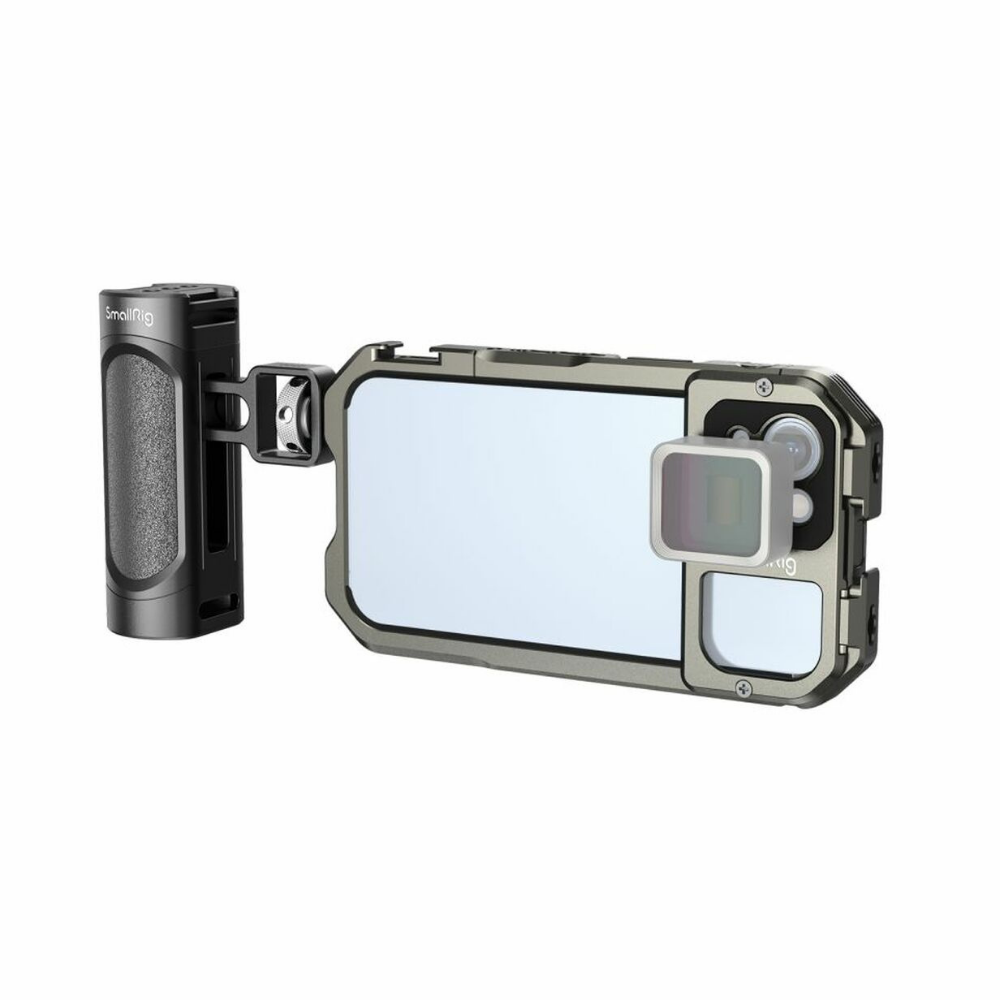 El kit de mano SmallRig para iPhone 13 3735 es el dispositivo perfecto para grabar vlogs, vídeos con el móvil, anuncios, etc. El kit incluye una jaula diseñada específicamente para el iPhone 13 y un asa lateral para una filmación más estable con el teléfono en la mano. La jaula está equipada con orificios de 1/4"-20 antirrotación y una rosca Cold Shoe para accesorios como el trípode BUT2429, el micrófono 3452 y la luz LED 3286, entre otros. Es compatible con objetivos con montura M para mejorar la calidad del vídeo. Su diseño hueco permite acceder a los botones, puertos y al objetivo ultra gran angular del iPhone. La carcasa metálica maciza con almohadillas integradas evita los arañazos y reduce las vibraciones. La carcasa permite grabar tanto en horizontal como en vertical.