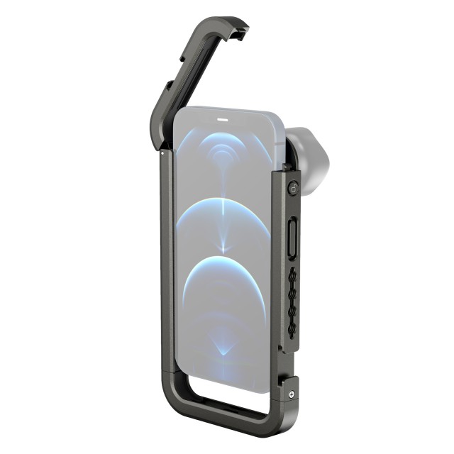 El SmallRig Handheld Video Rig para iPhone 12 Pro 3175 es el soporte perfecto para teléfonos móviles y para grabar vlogs, vídeos con el móvil, anuncios, etc. El kit incluye una carcasa diseñada específicamente para el iPhone 12 Pro y un asa lateral que permite grabar con mayor estabilidad al sostener el teléfono con la mano. Cuenta con dos soportes de fijación y varios orificios roscados de 1/4 para acoplar accesorios como micrófonos, luces LED, trípodes, etc. Admite grabación tanto en horizontal como en vertical. El soporte para objetivos situado en la parte trasera permite acoplar fácilmente un objetivo externo al teléfono.