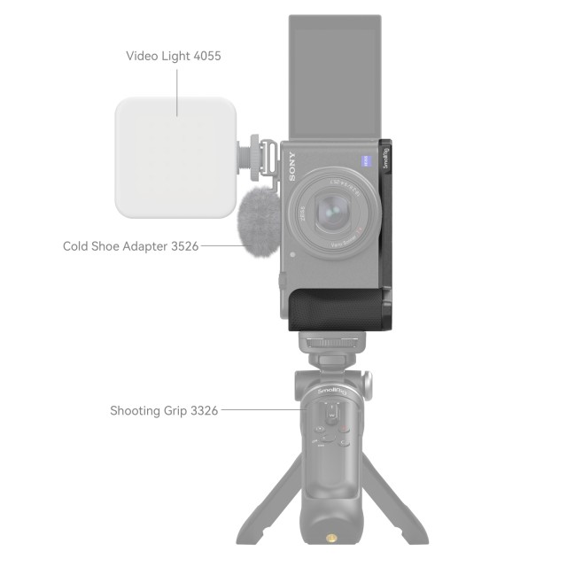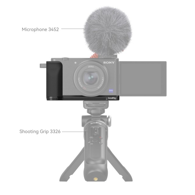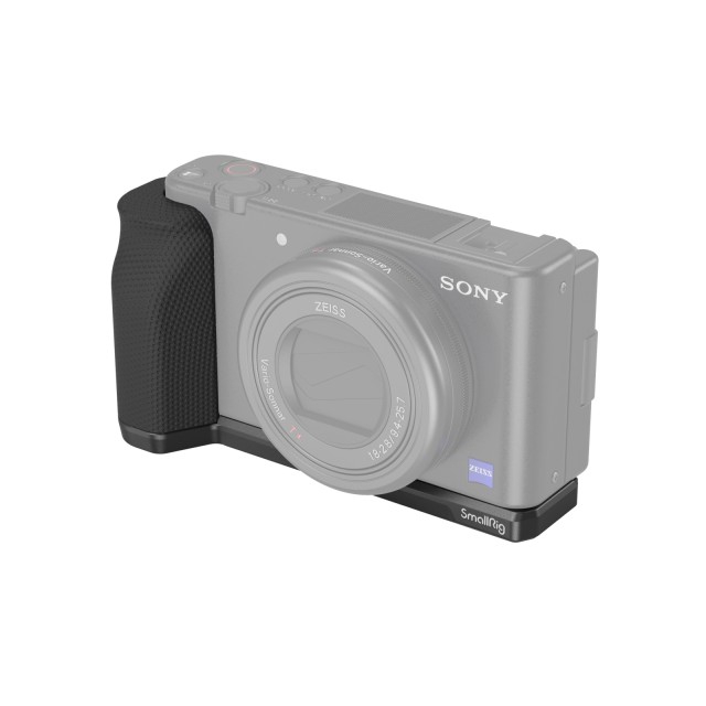 El mango SmallRig para Sony ZV-1F 4146 está diseñado para mejorar el agarre, proteger la parte inferior de la jaula y facilitar la grabación en vertical. El mango ergonómico de silicona se fija mediante un tornillo de 1/4"-20 con anilla en D, ofrece un agarre más firme que evita caídas accidentales y cuenta con un orificio roscado de 1/4"-20 en el lado derecho, en el centro del objetivo, para el agarre inalámbrico 3326, ideal para la fotografía en modo vertical. La empuñadura también cuenta con orificios con rosca de 1/4"-20 en la parte inferior para fijar una placa de fijación rápida y orificios para la correa en la placa inferior para la correa de mano PSW2398.