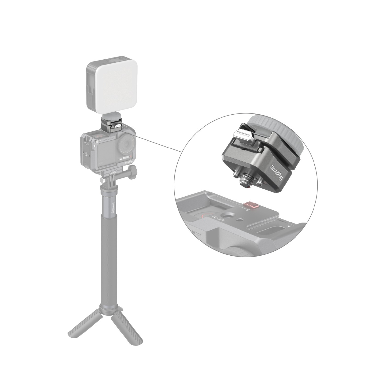 El soporte de liberación rápida SmallRig HawkLock H18 con zapata fría 4500 consta de un adaptador de liberación rápida para la zapata fría y una placa base de liberación rápida para la zapata fría. Con un solo clic, el pestillo antideslizamiento situado en la parte inferior del adaptador de liberación rápida, en combinación con el diseño ranurado de la parte superior de la placa base, bloquea la zapata en su sitio, lo que evita eficazmente que se deslice y garantiza un montaje fluido y seguro. Soporta hasta 800 g.