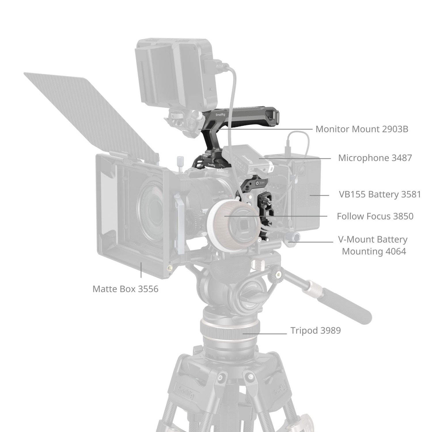 La jaula fija la cámara en su sitio mediante un único tornillo de 1/4"-20 en la base y dos bloques de posicionamiento a los lados, e incluye almohadillas de silicona integradas que evitan que se raye la cámara. La placa de fijación rápida Arca Swiss integrada permite un montaje sin problemas en trípodes tipo Arca (ID 4353, 4060) y estabilizadores DJI RS 2 / RSC 2 / RS 3 / RS 3 Pro / RS 4 / RS 4 Pro, lo que facilita el cambio rápido entre la configuración con estabilizador, el manejo manual y el trípode.
