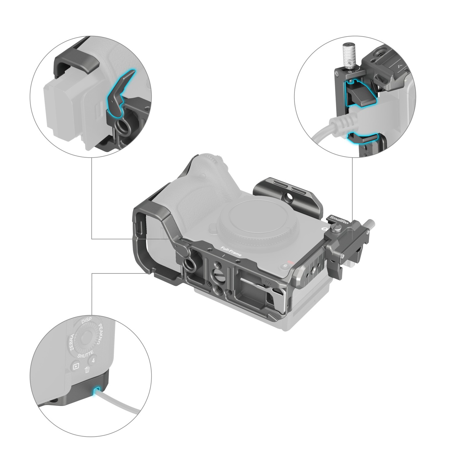 El kit de jaula de fijación rápida SmallRig HawkLock para Sony FX3 / FX30 4770 está diseñado para proteger la cámara y proporcionar puntos de montaje para accesorios. La jaula modular consta de un riel NATO y una jaula en forma de U. El riel NATO está fijado en la parte superior con dos tornillos de 1/4"-20 y se retira para poder instalar la empuñadura superior XLR original; la jaula en forma de U se fija con tornillos de 1/4"-20 a ambos lados y en la parte inferior para evitar que se deforme, con protección contra arañazos. En la tapa de la batería, el brazo de la bisagra se adapta a la curvatura de la cámara para facilitar el agarre con el meñique. Una abrazadera especial para el cable HDMI protege la interfaz y garantiza una transmisión estable de la señal.