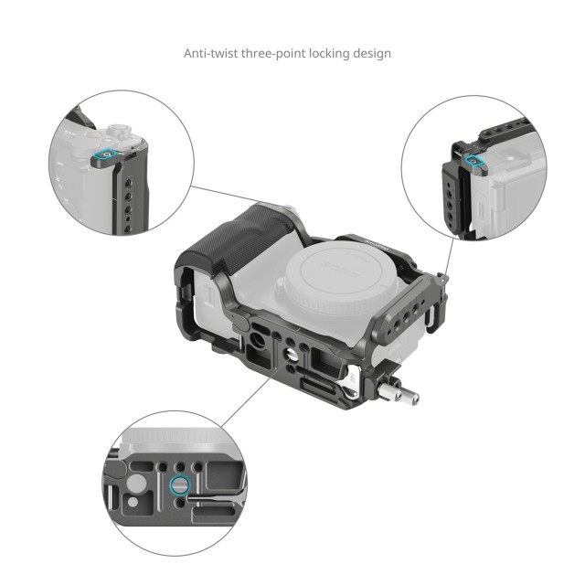 El sistema de bloqueo de tres puntos fija de forma segura la jaula a la cámara mediante un pasador de posicionamiento inferior, un tornillo de 1/4"-20 y un tornillo M2,5 en el lado izquierdo para evitar cualquier desviación, mientras que el acolchado en toda la superficie evita que la cámara se raye. El compartimento de la batería está equipado con una puerta abatible que se adapta mejor a las curvas del cuerpo de la cámara, lo que resuelve el problema del espacio para colocar el meñique y mejora el agarre.