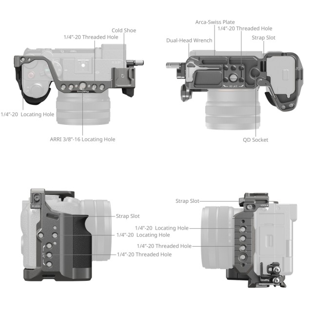 El kit de jaula de fijación rápida SmallRig «HawkLock» con empuñadura de silicona para Sony Alpha 7C II / 7CR 5198 está diseñado para ofrecer una experiencia fotográfica óptima con una protección completa, un agarre cómodo y opciones versátiles de fijación de la cámara. Este kit incluye la jaula, la abrazadera para el cable y el asa de silicona. Cuenta con el sistema de liberación rápida patentado «HawkLock» de SmallRig, que incluye un riel NATO y una placa de liberación rápida Arca-Swiss, lo que permite un montaje seguro y sin complicaciones de accesorios compatibles con «HawkLock» con un solo clic, como empuñaduras superiores (ID 4483), las empuñaduras laterales (ID 4485) y las placas de fijación rápida (ID 4486).
