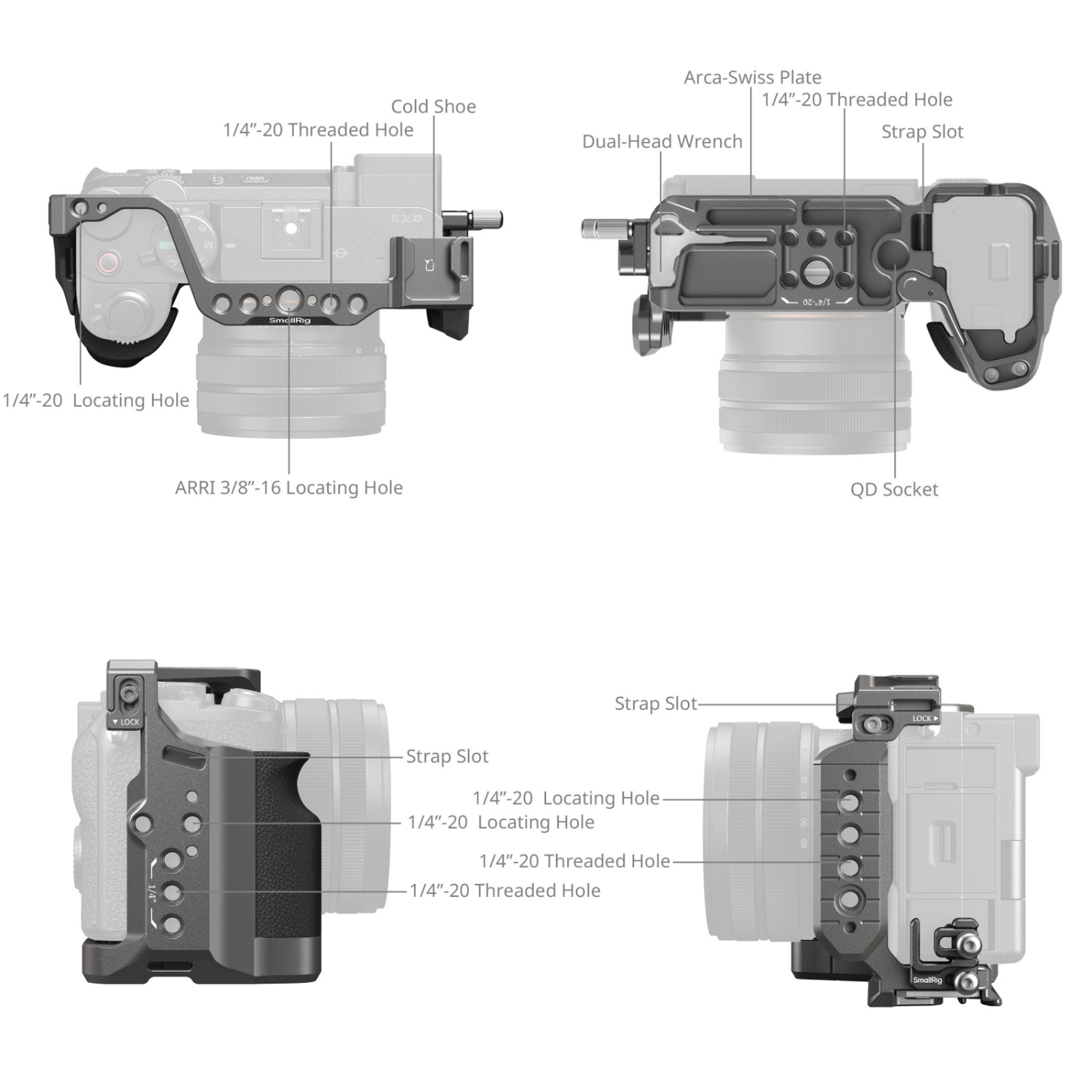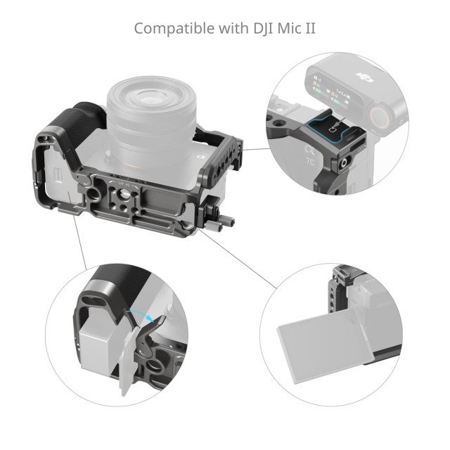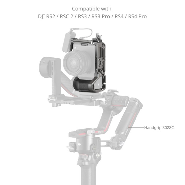 La jaula incluye diversas interfaces de montaje, entre ellas varios orificios roscados de 1/4"-20 y orificios de posicionamiento ARRI de 3/8"-16, que permiten fijar las empuñaduras superiores (ID 3765, 4757) o las asas laterales (ID 4755, 4840) para una mayor estabilidad al grabar a mano alzada. El soporte con zapata fría se puede utilizar para fijar micrófonos DJI MIC II o luces de vídeo. El orificio inferior con rosca de 1/4"-20 se puede utilizar para fijarlo a trípodes de mesa o estabilizadores DJI RS con placa de fijación rápida para DJI RS Mini. La placa de liberación rápida Arca-Swiss integrada facilita el cambio rápido entre los modos de grabación a mano alzada, con trípode y con estabilizador (compatible con DJI RS 2, RSC 2, RS 3, RS 3 Pro, RS 4 y RS 4 Pro). Además, cuenta con un conector QD para fijar correas QD, junto con orificios para correas a ambos lados y en la parte inferior para correas de muñeca (ID 3848), correas de hombro (ID PSC2428) y otros accesorios.