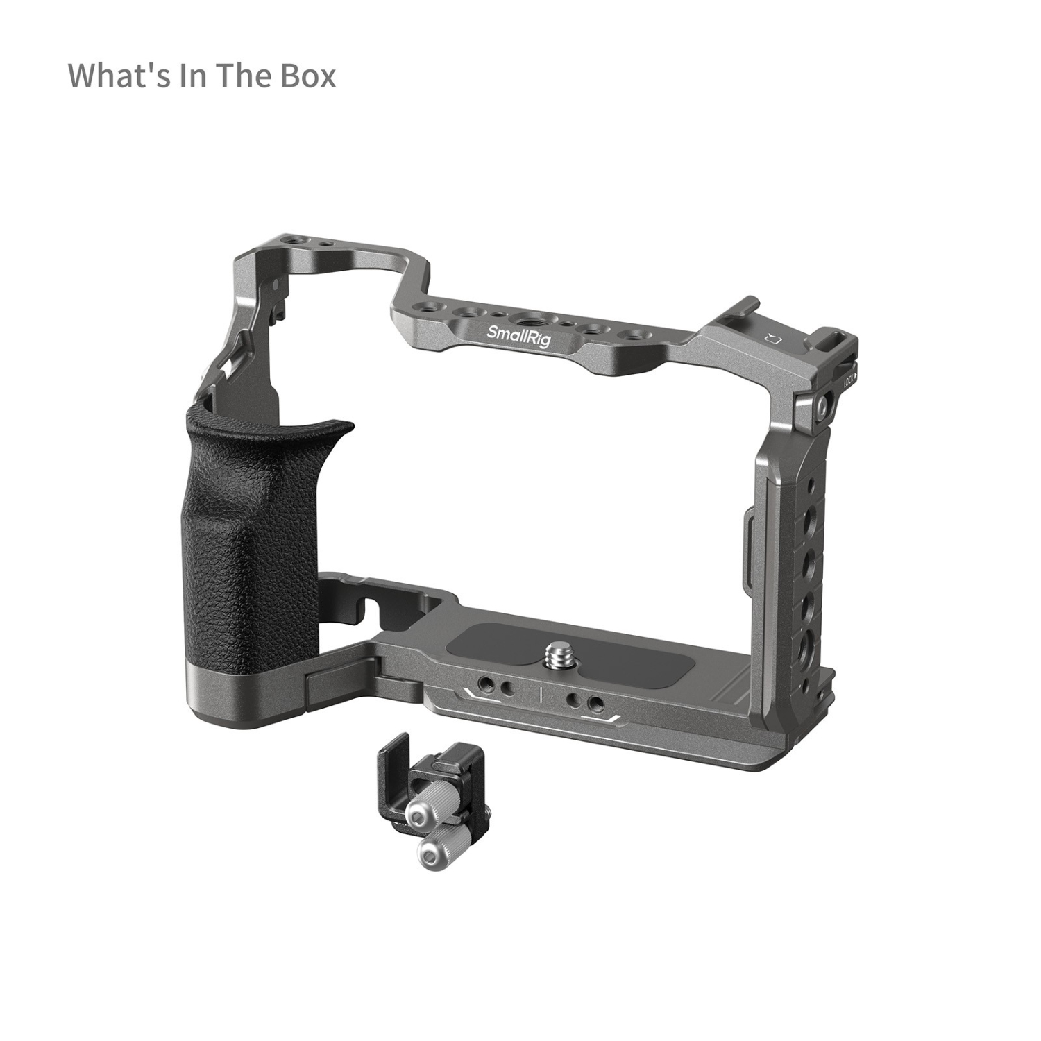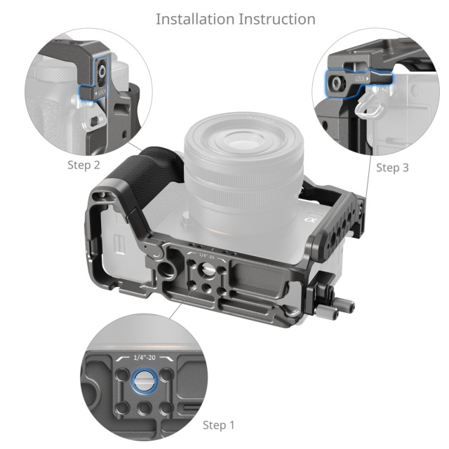 La jaula está equipada con un sistema de fijación de tres puntos que la asegura mediante un tornillo de 1/4"-20 en la parte inferior y dos bloques de posicionamiento a ambos lados, lo que garantiza una sujeción firme sin flexión. Las almohadillas de silicona inferiores protegen la cámara de arañazos. Además, el brazo abatible en la zona de la batería mejora el agarre al proporcionar un apoyo adicional para el meñique. La abrazadera del cable HDMI cuenta con una fijación sin herramientas asegurada mediante un tornillo de pulgar en el lado izquierdo de la jaula, lo que garantiza una conexión estable para una transmisión de datos fiable.