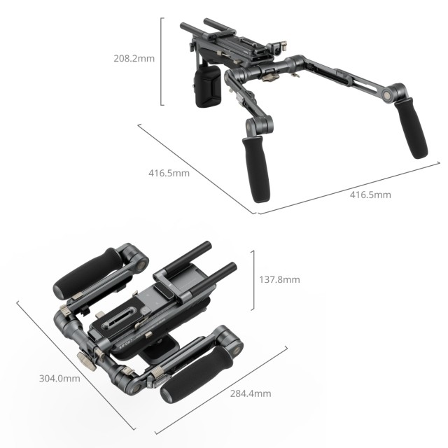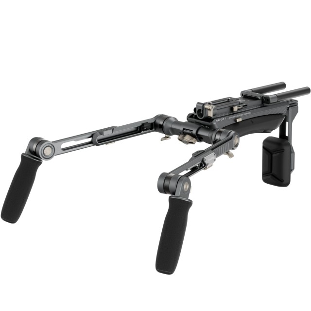El kit de soporte de hombro está equipado con asas ergonómicas de textura suave que proporcionan un agarre cómodo y facilitan el giro de 360°. El eje de conexión de los brazos extensibles se puede ajustar horizontalmente para un control optimizado, mientras que las almohadillas simplificadas para los hombros y la espalda proporcionan un apoyo excepcional. La almohadilla dorsal se ajusta hasta un ángulo de 90° para adaptarse perfectamente a cualquier ángulo de disparo, y la placa de fijación rápida permite ajustar fácilmente la parte delantera del brazo para un rápido equilibrio.