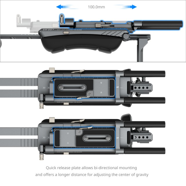 Gracias a la integración de los sistemas Arca-Swiss y Manfrotto, la placa de montaje dos en uno admite el deslizamiento bidireccional y un amplio ajuste del centro de gravedad, lo que permite una fijación rápida de las jaulas con placa Arca-Swiss.