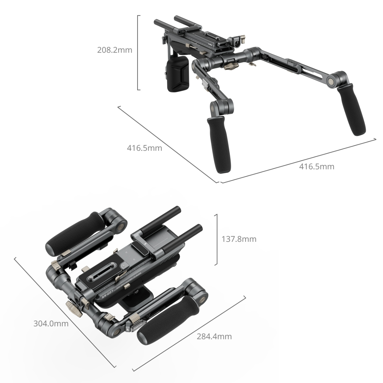 La empuñadura, fijada mediante una roseta ARRI, se puede desmontar y utilizar para acoplar otros accesorios. Las versátiles opciones de ampliación incluyen también orificios de posicionamiento integrados de 1/4"-20 en los brazos extensibles para fijar el monitor mediante un brazo mágico y una abrazadera de barra de 15 mm, junto con dos barras de 15 mm para el montaje del follow focus y baterías V-Mount. Varios orificios roscados de 1/4"-20 en la parte trasera sirven para colocar contrapesos, mientras que las abrazaderas para cables en ambos brazos extensibles mantienen el montaje en su sitio.