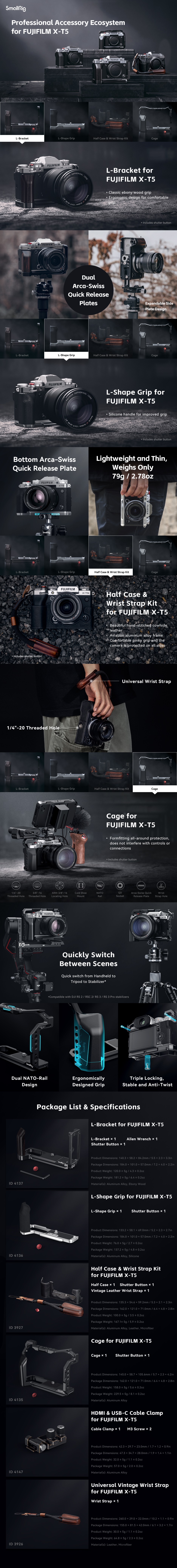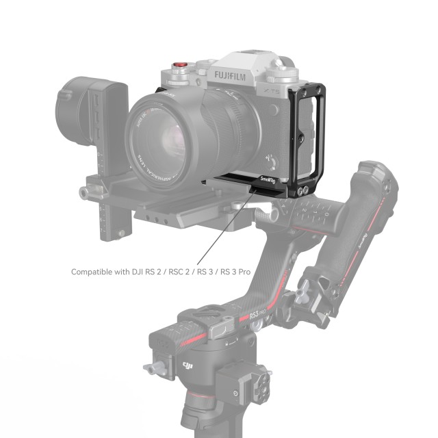El soporte SmallRig L-Bracket para la cámara FUJIFILM X-T5 4137 está diseñado para facilitar el cambio entre el modo horizontal y el vertical y mejorar la experiencia de sujeción. Sujeta la cámara mediante un tornillo de 1/4"-20 y un pasador de posicionamiento en la parte inferior, con almohadillas de goma que evitan los arañazos, y permite un acceso completo a los botones, las ranuras para tarjetas, el compartimento de la batería y la pantalla abatible. Además de la empuñadura integrada de madera negra para una mejor experiencia de sujeción, la placa también cuenta con varios puntos de fijación para accesorios. En su parte inferior se encuentra una placa de fijación rápida Arca-Swiss para trípodes Arca-Swiss y gimbals DJI RS 2 / RSC 2 / RS 3 / RS 3 Pro, orificios roscados de 1/4"-20 y orificios roscados de 3/8"-16, compatibles con la placa Manfrotto 1280 o el mango lateral 2093 para la captura vertical a mano alzada.