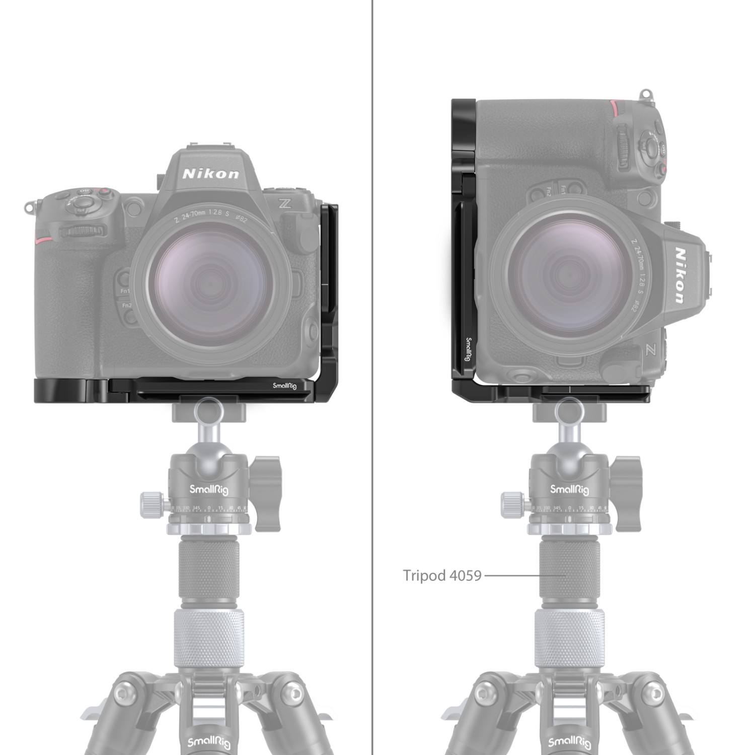 El soporte SmallRig L-Bracket para Nikon Z 8 3942 está diseñado para facilitar el cambio entre el modo horizontal y el vertical y mejorar la experiencia de sujeción. Sujeta la cámara mediante un tornillo de 1/4"-20 en la parte inferior y un pasador de posicionamiento, con arandelas de fricción que evitan los arañazos, y cuenta con un brazo de suspensión en la tapa de la batería que se adapta a la curvatura de la cámara, mejorando así el agarre. Hay varios puntos de fijación para accesorios: placa de fijación rápida Arca Swiss para trípodes tipo Arca o gimbals DJI RS 2 / RSC 2 / RS 3 / RS 3 Pro, orificios roscados de 1/4"-20 y 3/8"-16 en la parte inferior, compatibles con las empuñaduras laterales 2093 y 3847, la placa de fijación rápida 1280 y los orificios para correas de mano 3848 y 2456. El soporte L-Bracket también está equipado con un soporte QD para fijar la hebilla QD de la correa, orificios roscados de 1/4"-20, aptos para el soporte Cold Shoe Mount BUC2736 para micrófono, y también una placa lateral extensible de 23 mm que permite el paso de los cables durante la filmación vertical. Además, el paquete incluye una llave magnética para facilitar el desmontaje y el montaje.