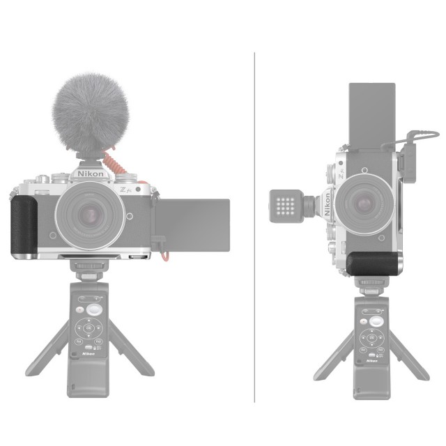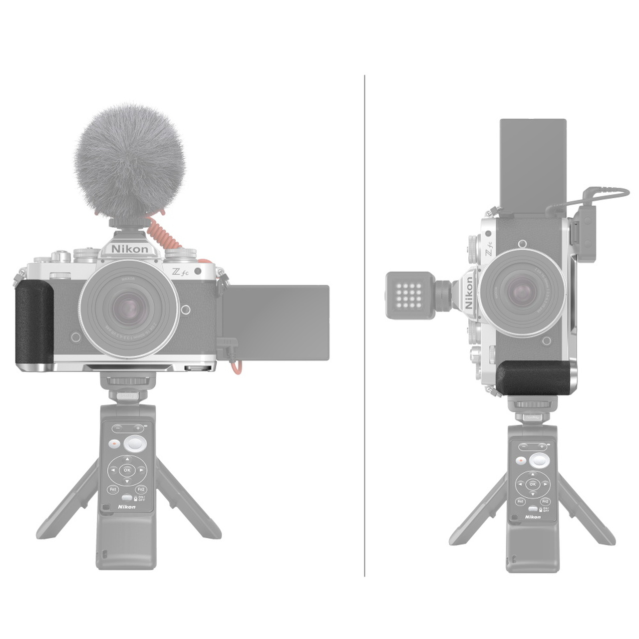 La empuñadura en forma de L SmallRig para la cámara Nikon Z fc 3480 está diseñada para ofrecer un agarre cómodo. Esta empuñadura de estilo retro tiene una textura y un color similares a los de la cámara; la placa base cuenta con el mismo acabado plateado que la cámara y se adapta a la perfección. La empuñadura en forma de L se fija a la cámara mediante un tornillo con anilla D de 1/4"-20 en la parte inferior y está equipada con un orificio roscado de 1/4"-20 integrado en la empuñadura, lo que permite fotografiar con el trípode en posición vertical. La placa base cuenta con una placa Arca Swiss integrada para cambiar rápidamente a la fotografía con trípode y un orificio roscado de 1/4"-20 en el centro, compatible con un trípode o una placa de fijación rápida Manfrotto. Además, la placa base cuenta con una zapata cold shoe integrada que permite acoplar micrófonos, luces y otros accesorios; la placa también dispone de un orificio para la correa de muñeca. La empuñadura presenta un diseño compacto y ligero que facilita su transporte.
