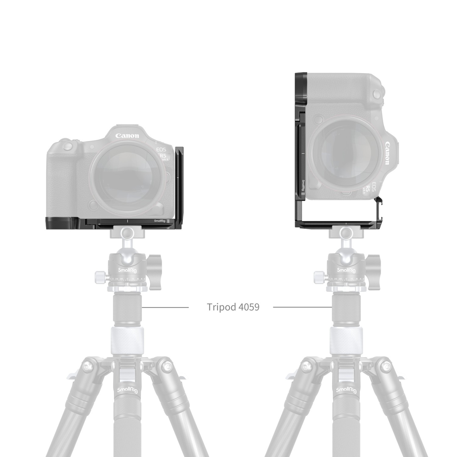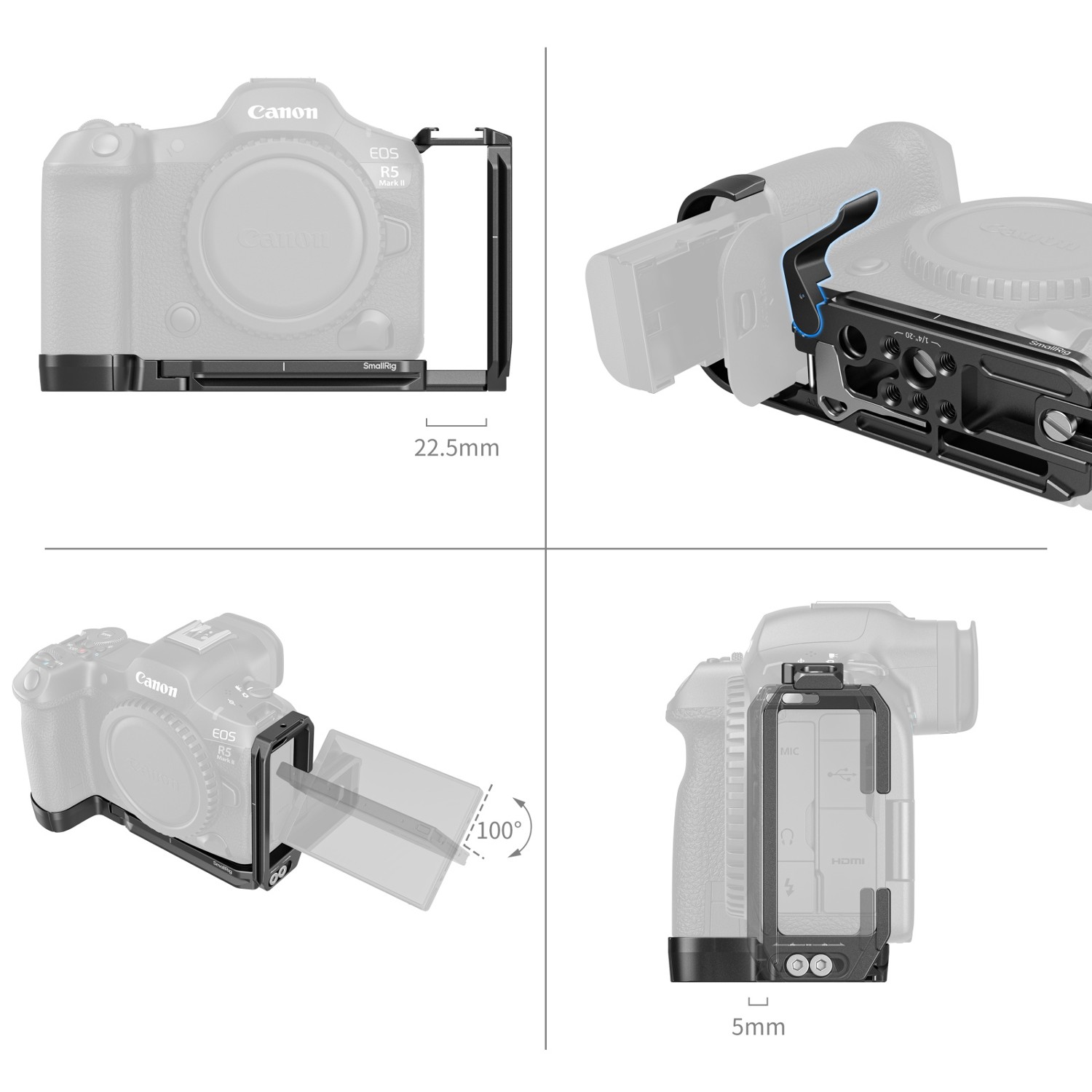 La placa de montaje en forma de L SmallRig para Canon EOS R5 Mark II 4983 está diseñada para ayudar a cambiar rápidamente entre la orientación horizontal y vertical, al tiempo que mejora el agarre de la cámara. La placa de montaje en forma de L se fija firmemente a la cámara mediante un tornillo de 1/4"-20 en la base y dos bloques de posicionamiento a los lados que evitan el desplazamiento, y está equipada con almohadillas de silicona integradas que protegen la cámara de arañazos.