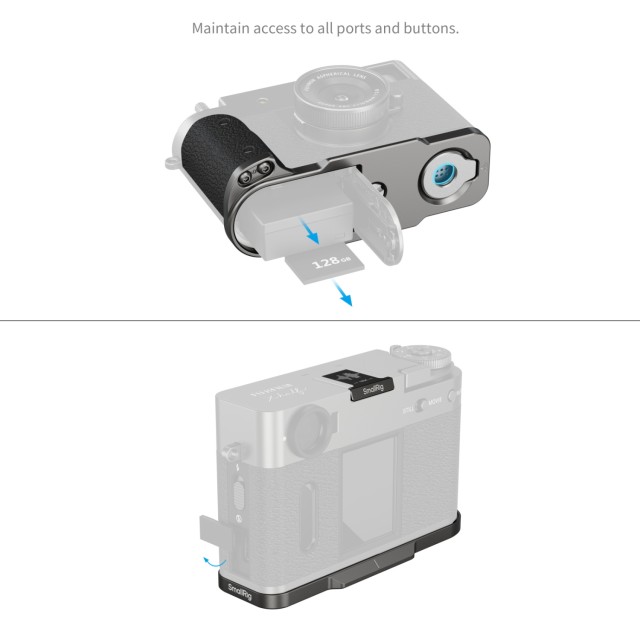 - Acceso completo a todos los puertos y controles, incluyendo el compartimento de la batería, el anillo de enfoque, la ranura para la tarjeta y los puertos para los altavoces.