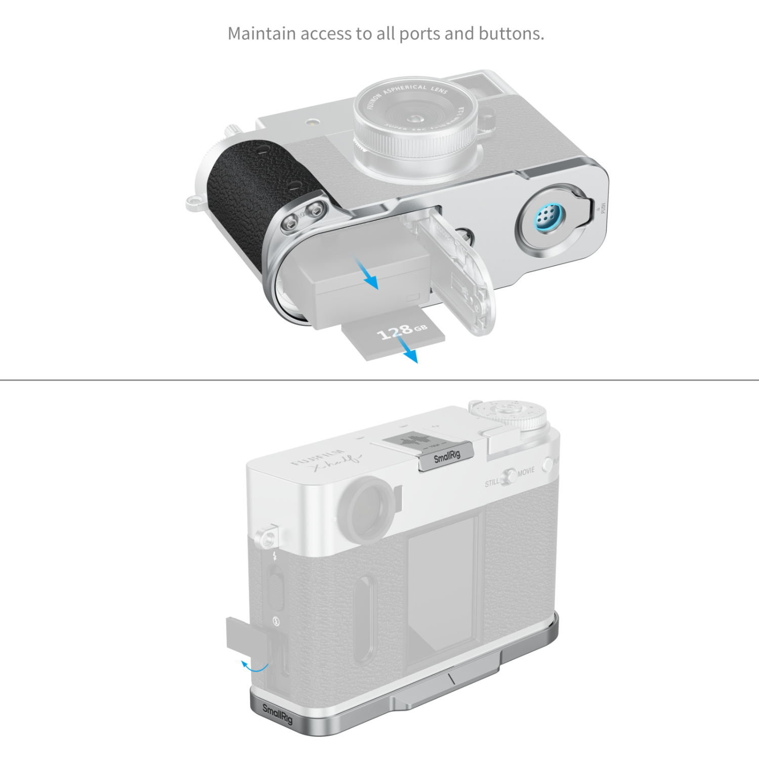 Acceso completo a todos los puertos y controles, incluyendo el compartimento de la batería, el anillo de enfoque, la ranura para tarjetas y los puertos para los altavoces.