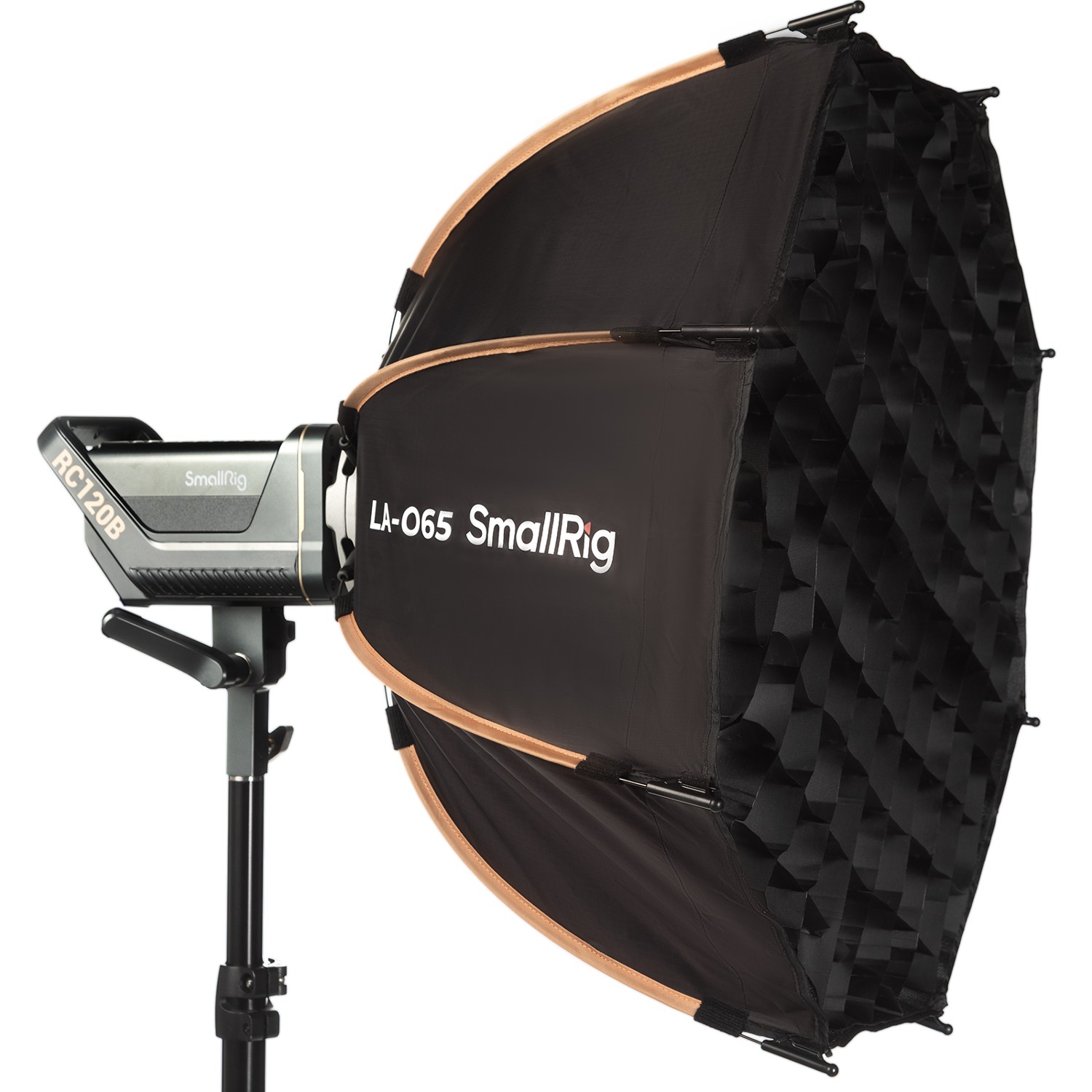 El SmallRig LA-O65 Octagonal Softbox 4874 es un softbox octogonal universal con un diámetro de 65 cm / 25,6 pulgadas. Cuenta con un diseño universal con montura Bowens y es compatible con los dispositivos SmallRig RC 120D / RC 120B / RC 220D / RC 220B / RC 350D / RC 350B / RC 450D / RC 450B, así como con dispositivos de otras marcas que utilicen el soporte Bowens para fuentes de luz puntuales disponibles en el mercado. El softbox está equipado con el último diseño de montaje rápido, que permite una fácil instalación y desmontaje en un solo paso y garantiza una experiencia de usuario sin complicaciones. La rejilla de panal de 45° incluida regula eficazmente la difusión de la luz, por lo que es adecuado para una amplia gama de escenarios. Gracias al uso de materiales de calidad industrial y revestimientos altamente reflectantes, el softbox octogonal LA-O65 se suministra de serie con dos telas difusoras para aumentar el efecto de luz suave o la transmisión de luz, según sus necesidades.