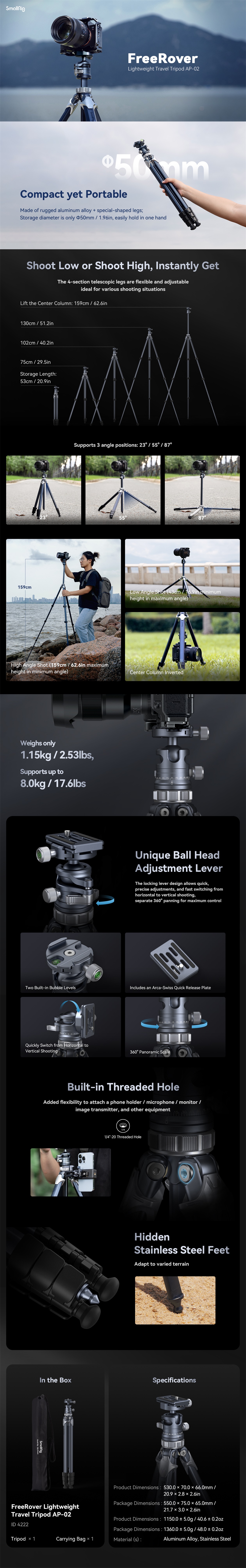 El trípode de viaje ligero SmallRig AP-02 4222 es un trípode compacto de aleación de aluminio diseñado especialmente para la fotografía. Incorpora tubos de patas y un poste central de sección no circular para lograr la máxima compacidad y ahorro de espacio, al tiempo que mantiene una estabilidad óptima. El tornillo superior de 1/4"-20 y 3/8"-16 es compatible con diversas rótulas fluidas para fotografía y grabación de vídeo; y los tres orificios roscados de 1/4"-20 en las articulaciones de las patas permiten acoplar los brazos Magic Arm 3238 y 2115C para micrófono, monitor, sistema de transmisión de imagen, etc. Las almohadillas de silicona de las patas tienen puntas ocultas que se adaptan a terrenos de diversa complejidad y pueden utilizarse incluso tras retirar las almohadillas de silicona de las patas.
