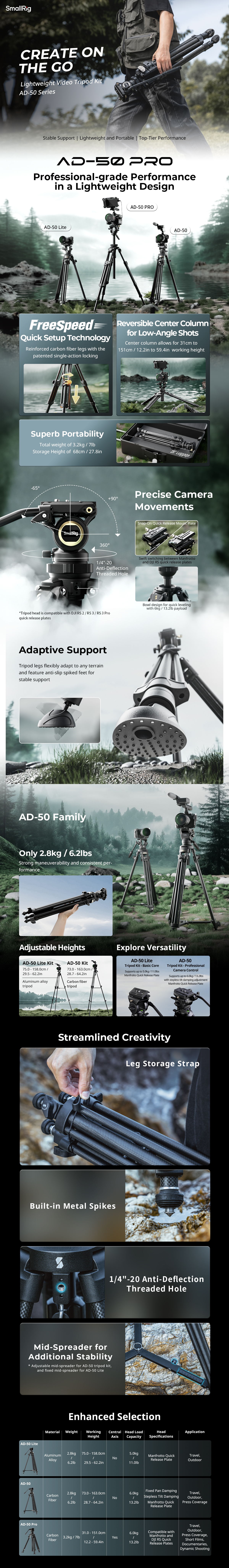 Artículo de exposición, presenta un arañazo en una pata, sin que ello afecte a su funcionamiento. El kit de trípode ligero de fibra de carbono SmallRig AD-50 Pro 4420 está diseñado para la videografía profesional al aire libre. Está equipado con la tecnología FreeSpeed, que utiliza un sistema de bloqueo en un solo paso: el control de un único interruptor permite bloquear rápidamente las dos secciones de las patas. Tanto las patas como el poste central están fabricados en fibra de carbono, lo que garantiza una estructura ligera con una estabilidad excepcional y una gran capacidad de carga. La altura de trabajo oscila entre 31 cm (12,2 pulgadas) y 151 cm (59,4 pulgadas), y la longitud de almacenamiento compacto es de 68 cm (26,8 pulgadas). El poste central está equipado con una base de copa integrada que permite un ajuste para una rápida nivelación, con una llave Allen extraíble incorporada en el cabezal de vídeo para un cómodo montaje y desmontaje del equipo de cámara, y la posibilidad de grabar en ángulo bajo a una altura mínima de 31 cm (12,2 pulgadas). El diseño compacto del trípode permite que quepa en cualquier equipaje estándar.