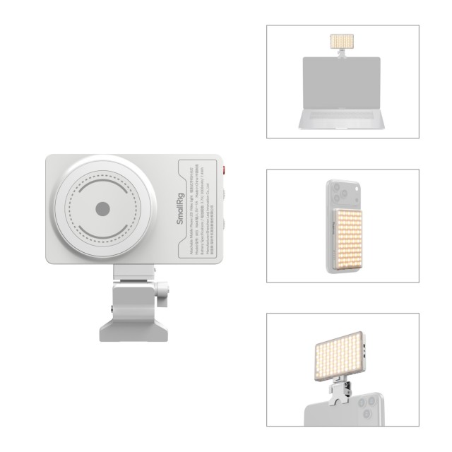 La luz LED de vídeo acoplable SmallRig M3 para teléfonos móviles (azul hielo) 5640 ofrece una solución de fijación universal con compatibilidad MagSafe para conectarla y desconectarla al instante. Funciona a la perfección con los iPhone compatibles con MagSafe o se acopla fácilmente a dispositivos Android mediante el anillo metálico incluido: ¡una fijación segura en tan solo un segundo! Además, cuenta con una base de fijación rápida que permite montarla en horizontal o en vertical en monitores o portátiles en cuestión de segundos, complementada con un ajuste de inclinación de 170° para una colocación perfecta: ¡garantiza una instalación sin herramientas y un ajuste de la iluminación sin complicaciones!