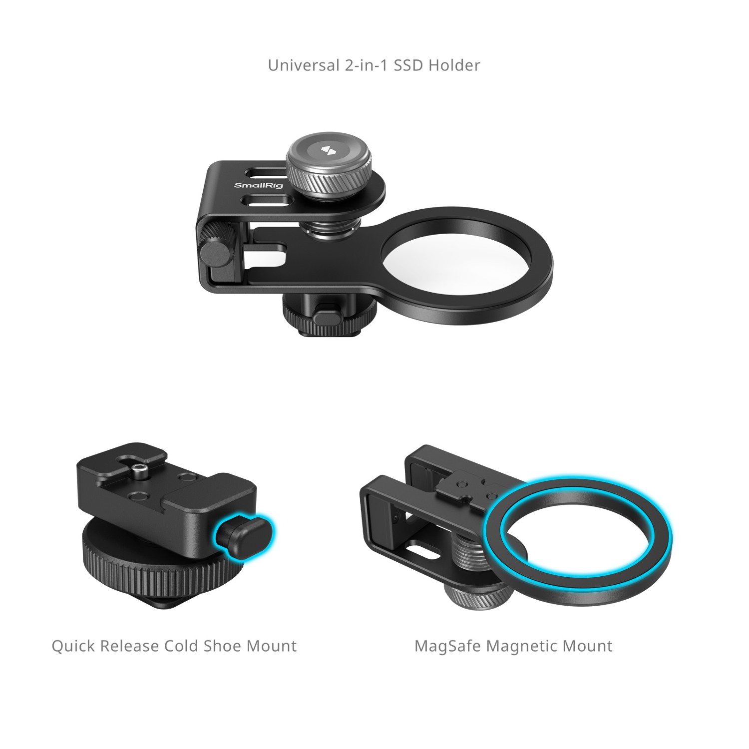 El soporte universal 2 en 1 SmallRig MagSafe / Cold Shoe para SSD 4779 está diseñado para conectar discos duros externos USB-C al tomar fotografías con un smartphone. Es compatible con discos SSD de un grosor de entre 8,0 y 16,0 mm, especialmente con los modelos Samsung T7, Samsung T7 Shield y Samsung T9. La abrazadera está equipada con un soporte cold shoe deslizante que se puede instalar rápidamente en la base de la abrazadera, lo que permite la conexión a diversos dispositivos. Para la fijación magnética MagSafe en los lugares deseados, como ordenadores portátiles o iPhones con MagSafe, se puede retirar el soporte cold shoe. Ambos métodos de instalación son sencillos y rápidos, lo que facilita transiciones fluidas entre los distintos escenarios de uso. Además, la abrazadera cuenta con un acolchado de silicona que evita que se raye el disco SSD. La abrazadera para cables de la base sujeta el cable USB-C mediante un tornillo de mariposa para una transferencia de datos cómoda y estable. Además, incluye una etiqueta metálica en forma de anillo para un uso versátil en diversos entornos.