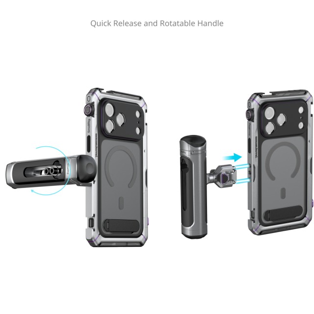 El teléfono se puede fijar a la jaula incluso con la funda puesta. La jaula cuenta con varios orificios roscados de 1/4"-20 y soportes para zapata fría, que se puedenampliar con accesorios como empuñaduras, trípodes, micrófonos y luces. Las clásicas interfaces de liberación rápida permiten un ajuste eficaz tanto a mano como con trípode.