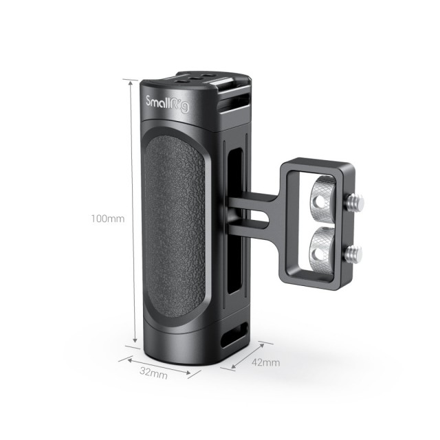 La empuñadura lateral SmallRig Mini (tornillos 1/4"-20) 2916 está diseñada para cámaras sin espejo, cámaras digitales y otras cámaras pequeñas. En el lateral de la jaula hay dos tornillos de 1/4"-20. La empuñadura admite otras opciones de fijación: el flash y el micrófono se pueden fijar mediante la zapata fría 1241, y a través de la anilla se puede fijar una correa de muñeca, por ejemplo la 2456, para evitar que la cámara se caiga accidentalmente. Altamente ajustable para diferentes alturas de la jaula y permite cambiar rápidamente de la mano izquierda a la derecha mediante una llave integrada. El asa portátil está fabricada en aleación de aluminio y plástico (PC+ABS) con un diseño ergonómico y proporciona a los cineastas una filmación fluida y cómoda.