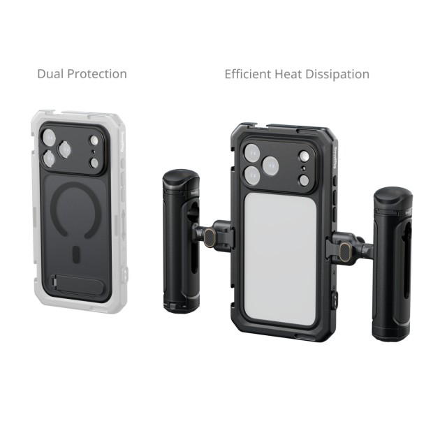 El kit SmallRig Mobile Dual Handheld para iPhone 17 Pro 5540 es una solución profesional para la grabación manual diseñada específicamente para el iPhone 17 Pro, que facilita la grabación profesional de vídeos, las retransmisiones en directo y la producción de cortometrajes. Este completo kit incluye una funda para el teléfono, una jaula de vídeo, un mango lateral giratorio inalámbrico, un mango lateral giratorio y un protector blando de TPU.