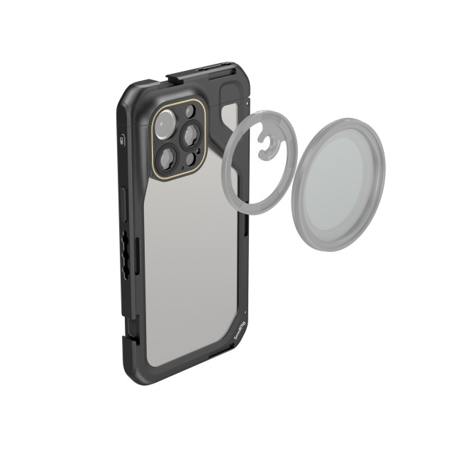 La jaula para vídeo móvil SmallRig Mobile Video Cage para iPhone 15 Pro Max 4391 es una jaula multifuncional para teléfonos móviles diseñada específicamente para el iPhone 15 Pro Max, que permite grabar vídeos de alta calidad, retransmitir en directo y grabar vlogs. Esta jaula, compacta y con un diseño que se adapta perfectamente al teléfono, pesa solo 116 g. Está equipada con orificios roscados de 1/4"-20 y zapatas de montaje para fijar empuñaduras, trípodes, micrófonos, luces LED para vídeo, etc., lo que facilita y agiliza el uso de un ecosistema de fijación rápida totalmente nuevo. En ambos lados hay orificios para correas de menos de 2 mm de diámetro. Permite acoplar un objetivo con montura M o, tras cambiar la placa trasera del objetivo, un objetivo de la serie T de Moment con rosca de 17 mm / 37 mm. Está ligeramente ahuecada para garantizar un acceso completo a todos los botones, puertos, al objetivo ultra gran angular con radar y al cargador inalámbrico MagSafe. Su diseño fácil de usar, con cierre y liberación rápidos, es más seguro y estable, y evita el desbloqueo accidental por un toque involuntario. La carcasa metálica maciza también cuenta con almohadillas integradas que evitan posibles golpes y arañazos. El uso de esta carcasa no afecta en absoluto a la posibilidad de tomar fotografías horizontales o verticales.
