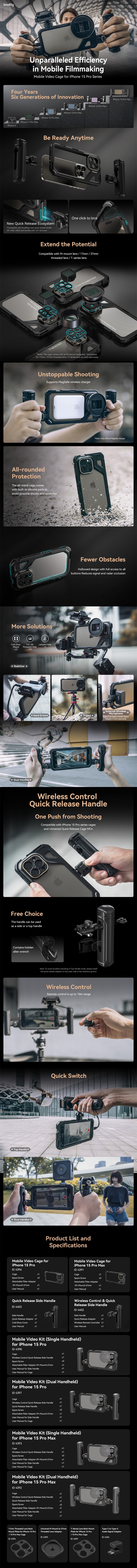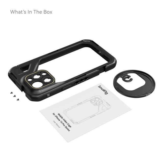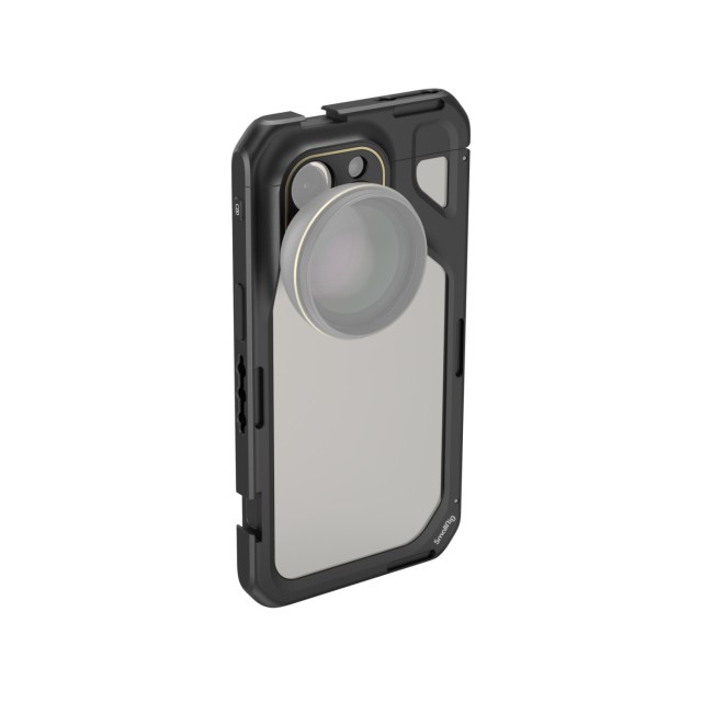 La jaula de vídeo móvil SmallRig para iPhone 15 Pro Max 4391B es una jaula multifuncional para teléfono móvil diseñada específicamente para el iPhone 15 Pro Max, que permite realizar grabaciones de vídeo de alta calidad, retransmisiones en directo y grabaciones de vlogs. Esta jaula compacta y ajustada al diseño del dispositivo pesa solo 116 g. Está equipada con orificios roscados de 1/4"-20 y pies de fijación para montar un mango, un trípode, un micrófono, una luz LED de vídeo, etc., lo que facilita y agiliza el uso de un ecosistema de fijación rápida totalmente nuevo. En ambos lados hay orificios para correas de menos de 2 mm de diámetro. Permite acoplar un objetivo con montura M o, tras cambiar la placa trasera del objetivo, un objetivo de la serie T de Moment con rosca de 17 mm / 37 mm. Está discretamente recortada para garantizar un acceso completo a todos los botones, puertos, radar y objetivo ultra gran angular, así como al cargador inalámbrico MagSafe. Su diseño fácil de usar, con cierre y liberación rápidos, es más seguro y estable, y evita el desbloqueo accidental por un toque involuntario. La carcasa completa de metal también cuenta con almohadillas integradas que evitan posibles golpes y arañazos. El uso de esta carcasa no afecta en absoluto a la posibilidad de tomar fotografías horizontales o verticales.