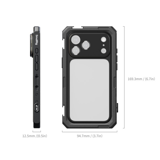 El teléfono se puede fijar a la jaula incluso con la funda protectora puesta. La funda protectora blanda cuenta con varios orificios roscados de 1/4"-20 con protección antitorsión y soportes para pies de trípode, que se pueden ampliar con accesorios como empuñaduras, trípodes, micrófonos y luces. La interfaz simplificada de liberación rápida permite un ajuste eficaz tanto a mano como en trípode.